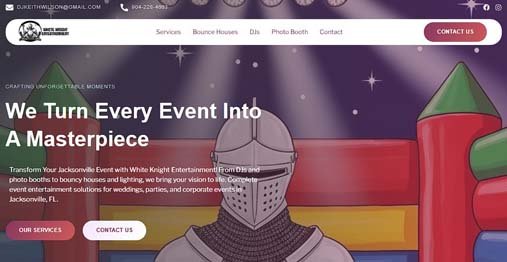 I created a comprehensive brand transformation for White Knight Entertainment, Jacksonville’s premier event company, including website development, complete brand identity redesign, custom logo and mascot creation, and ongoing social media management. This project established a cohesive visual identity that reflects their family-owned values while showcasing their full range of entertainment services from weddings to corporate events across Northeast Florida.