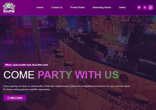 I developed the complete digital presence and marketing strategy for Eclipse Bar & Nightclub, Jacksonville’s premier alternative nightlife venue. This comprehensive project included website development, social media channel establishment and management, event creation and coordination, custom event flyer design, and ongoing graphics creation for business marketing. The edgy, authentic design captures Eclipse’s unique community atmosphere while effectively promoting themed nights, live performances, and special events that define Jacksonville’s diverse nightlife scene.